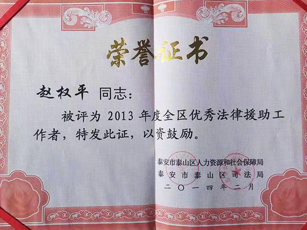 赵权平被评为2013年度全区法律援
